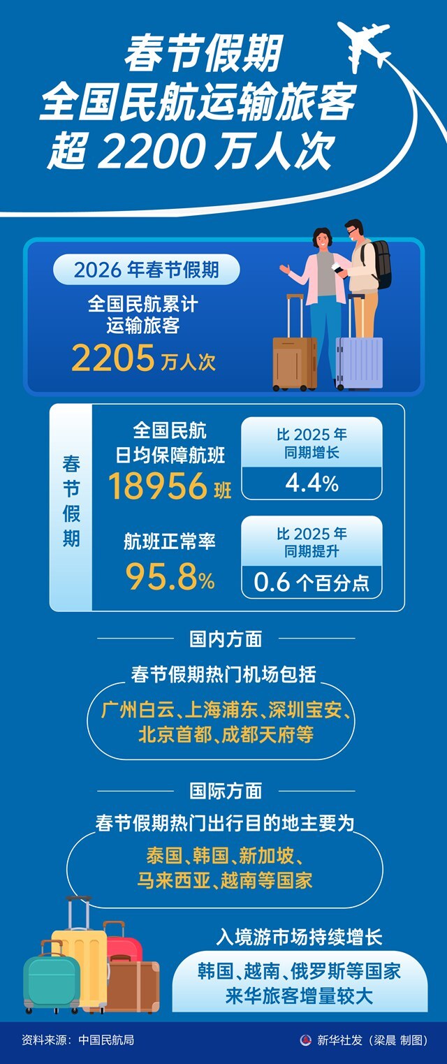 记者2月24日从中国民航局获悉,2026年春节假期,全国民航累计运输旅客2205万人次。