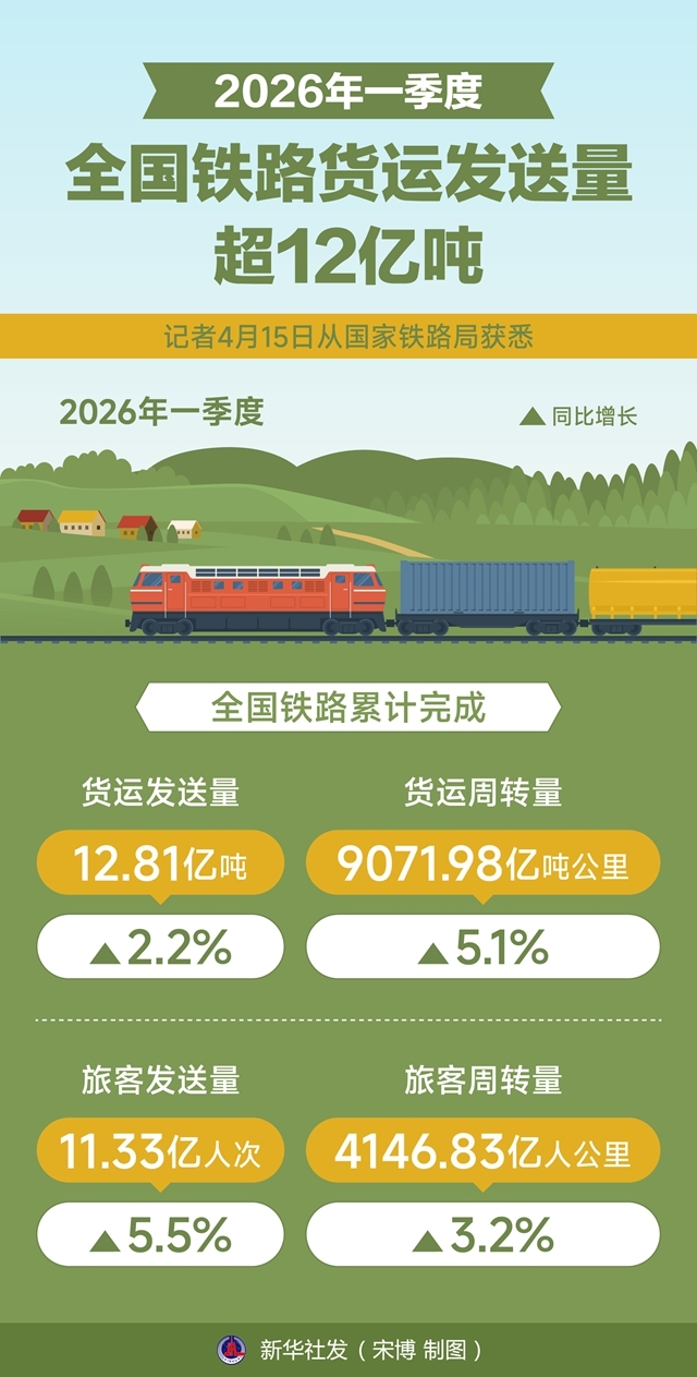 记者4月15日从国家铁路局获悉,一季度,全国铁路累计完成货运发送量12.81亿吨,同比增长2.2%;完成货运周转量9071.98亿吨公里,同比增长5.1%。